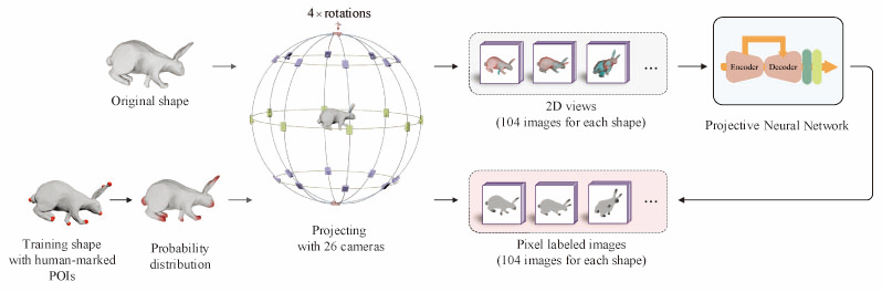 成果简介:检测三维形状上的兴趣点是计算机视觉和图形学中的基础研究问题。由于三维兴趣点自身几何特征的复杂性,检测任意给定的三维形状上的兴趣点仍然是一个非常具有挑战性的问题。现有的基于数据驱动的三维兴趣点检测算法主要侧重于利用手工设计的几何特征来预测每个顶点是否为三维兴趣点的概率,由于目前国际学术界缺乏高质量的公开训练数据,现有检测算法的性能受到极大的限制。我们提出了一种基于投影神经网络的三维兴趣点检测算法。该算法首先将三维形状训练集投影到多个二维视图,然后以端到端的方式从二维视图中学习有效特征。最后,在三维形状上利用学习到的神经网络进行检测,并结合改进的密度峰值聚类算法得到最终的检测结果。该算法具有既不依赖手工制作的特征描述符也不依赖大量昂贵的三维训练数据的优点。在国际学术界公开数据集上的实验结果表明,该算法的性能明显优于已有算法。该项成果以舒振宇教授为第一作者,于2022年发表在国际计算机领域权威期刊《IEEE Transactions on Multimedia》上。